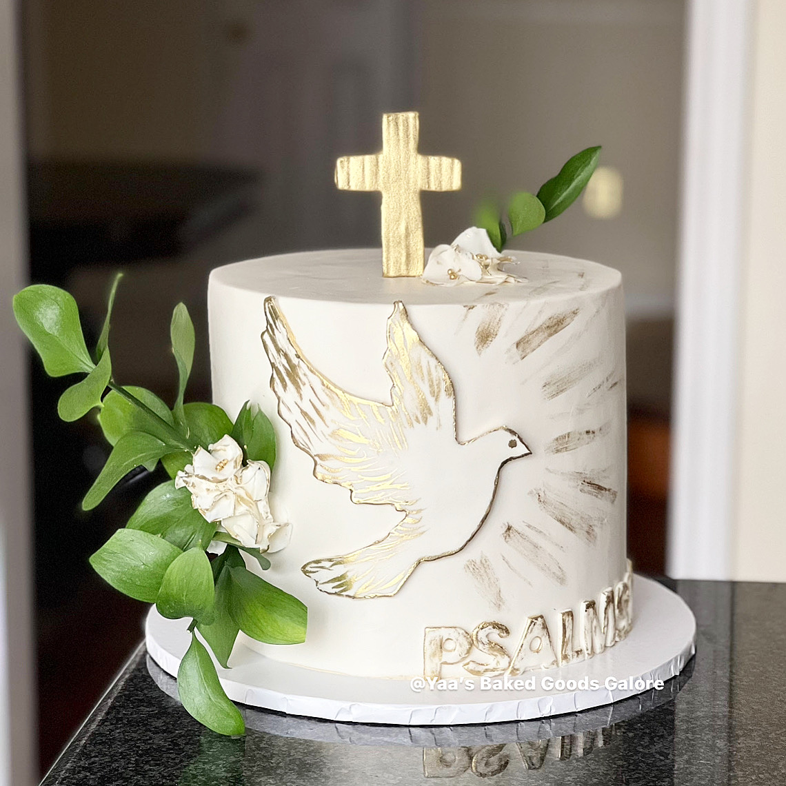 10” Vanilla and Red velvet cake with handmade dove and cross