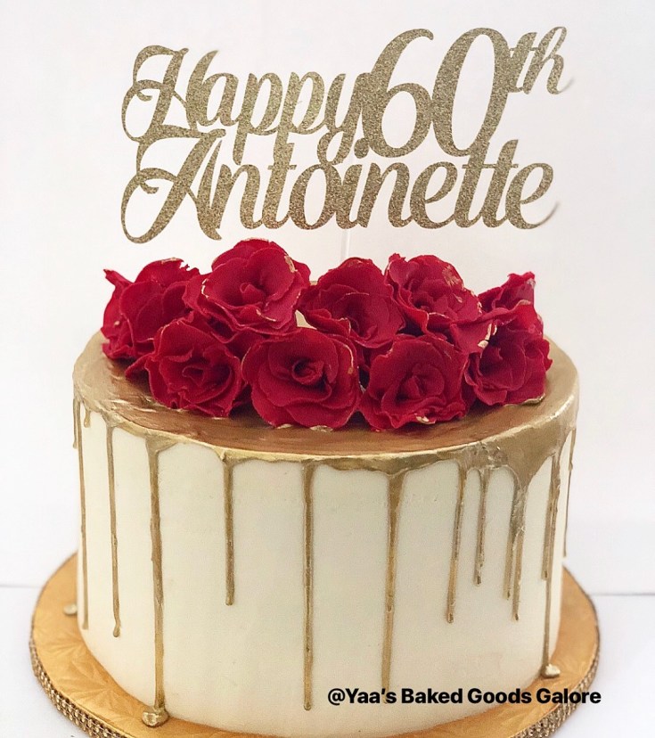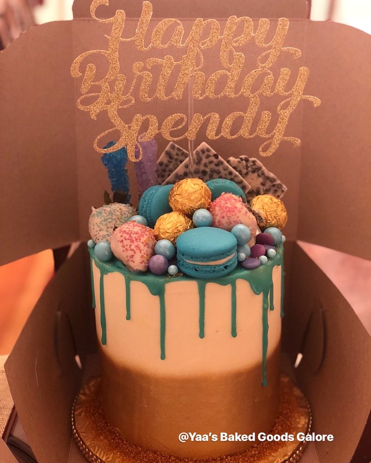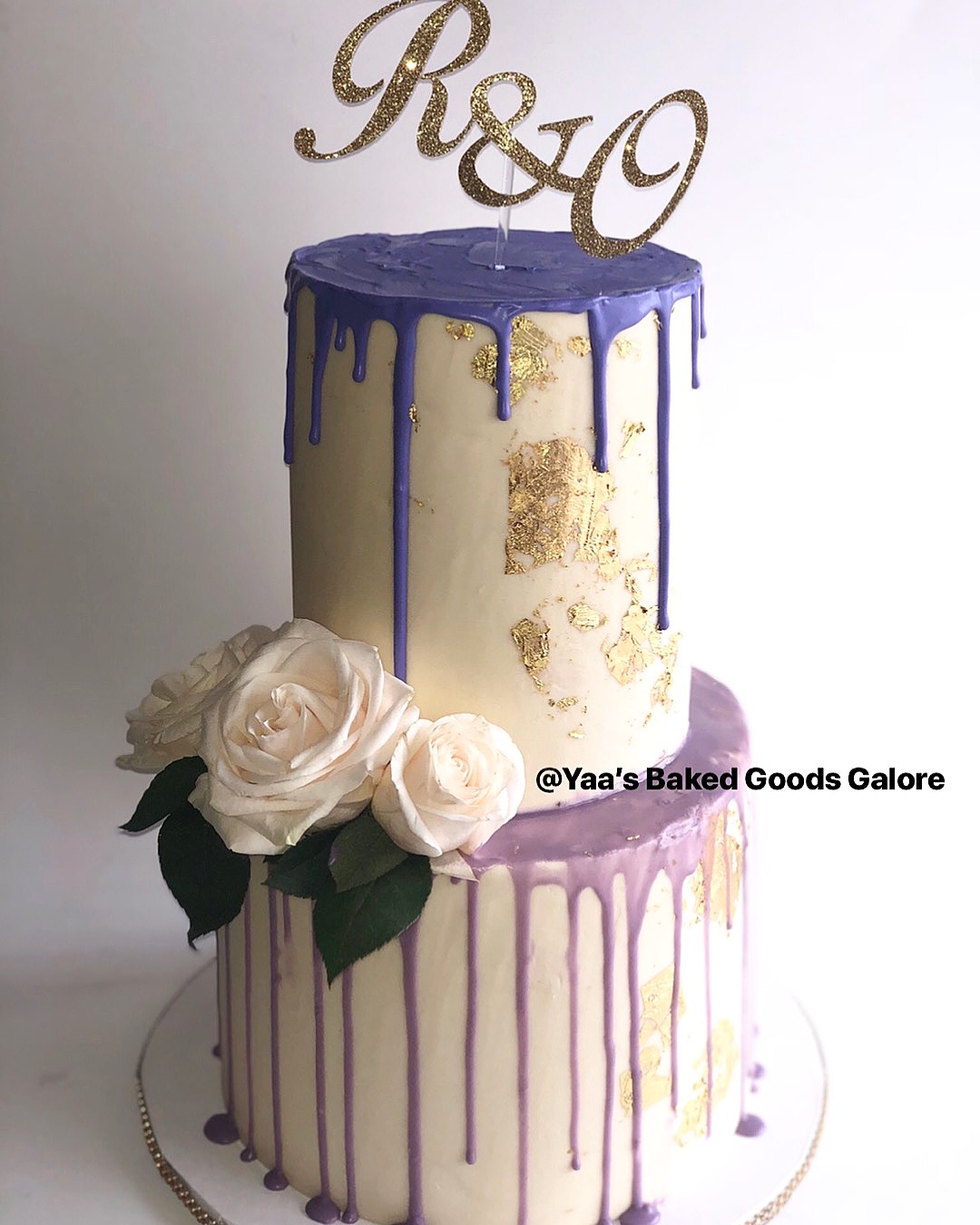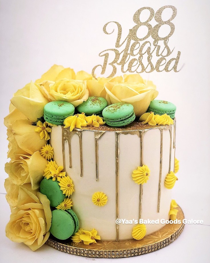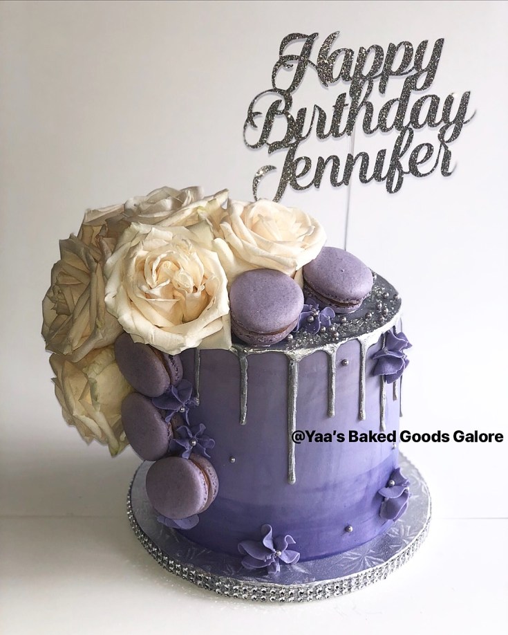 8″ 4 layer Vanilla drip cake w/ fresh roses and macarons