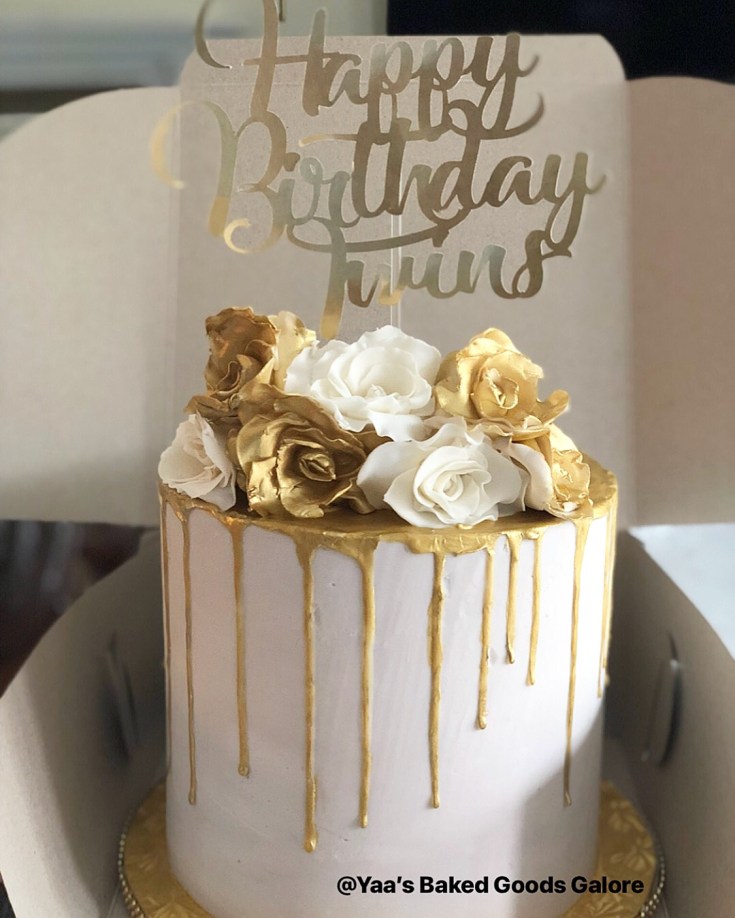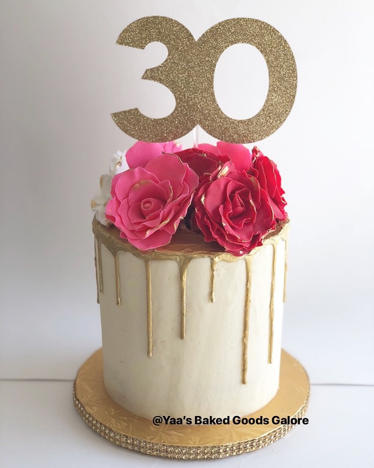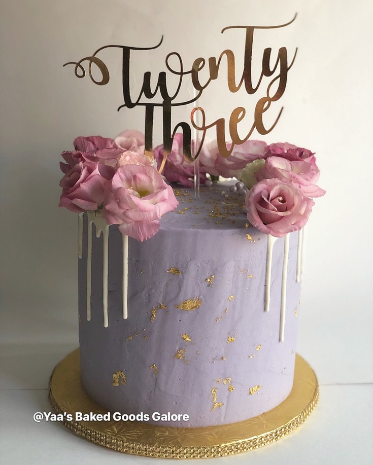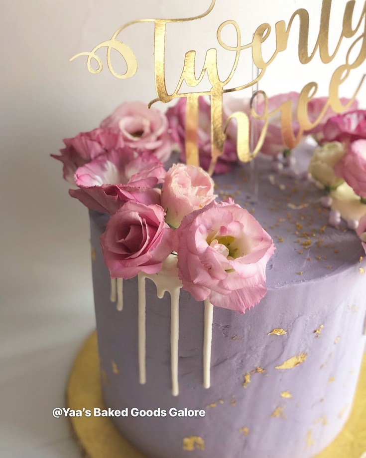 8″ 4 layer drip Vanilla cake w/ fresh flowers & edible gold leaf