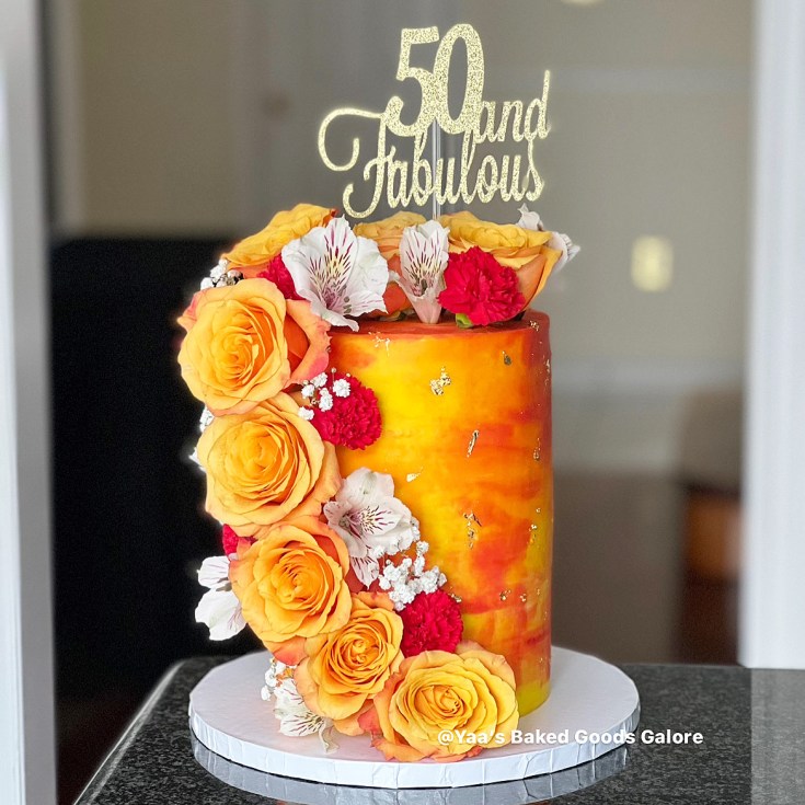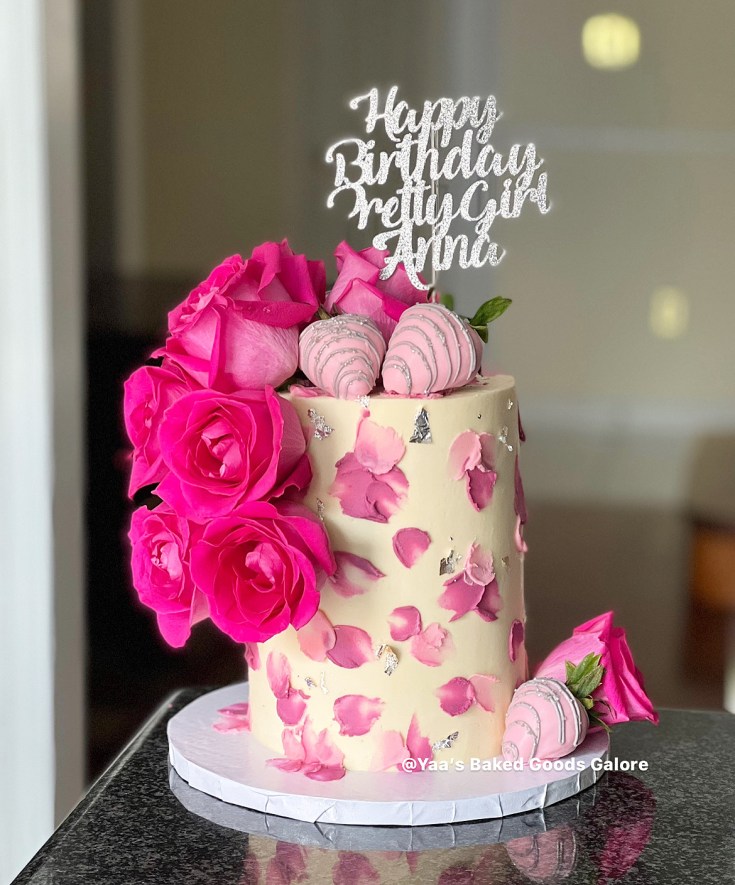6” Vanilla and Red velvet birthday cake with fresh roses and chocolate covered strawberries