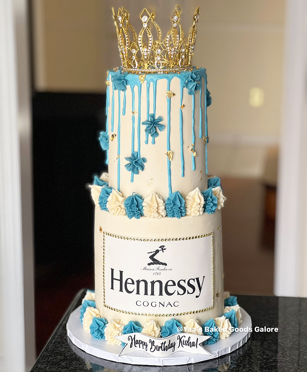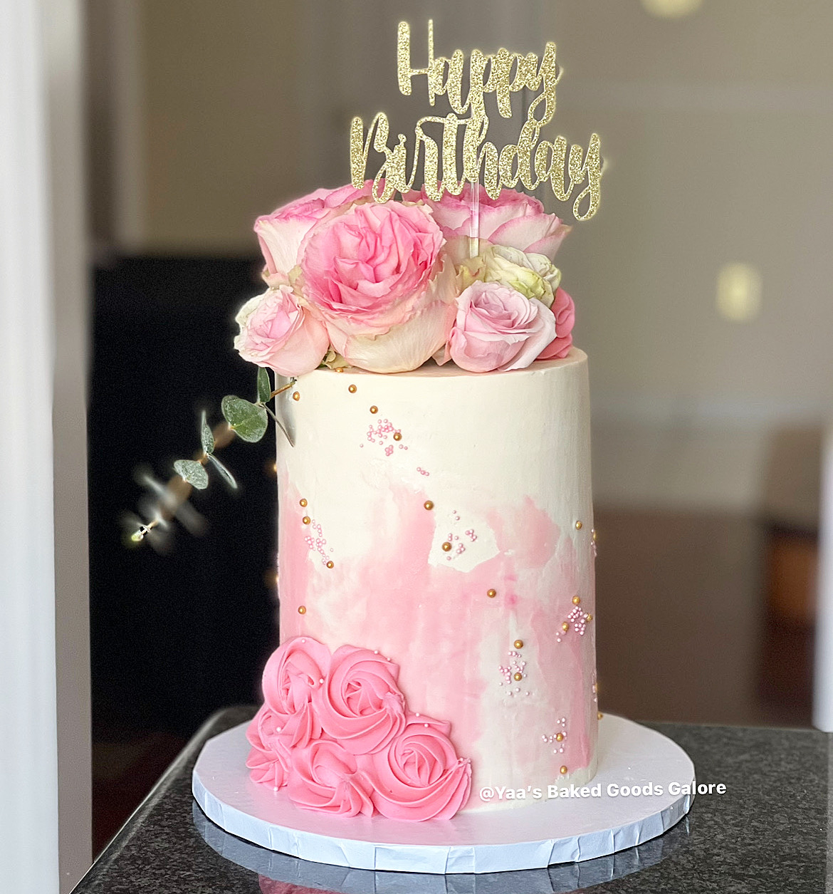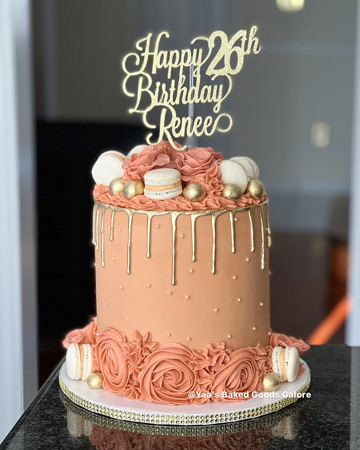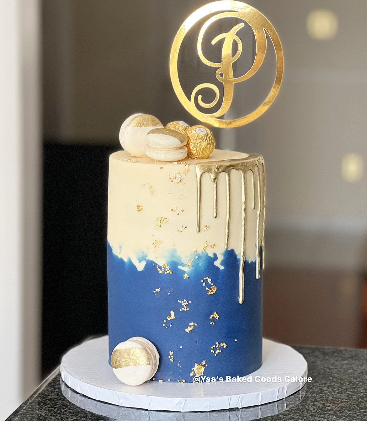 6” Vanilla and Red velvet birthday cake with a drip, pearls, gold leaf, macarons and ferrero rocher