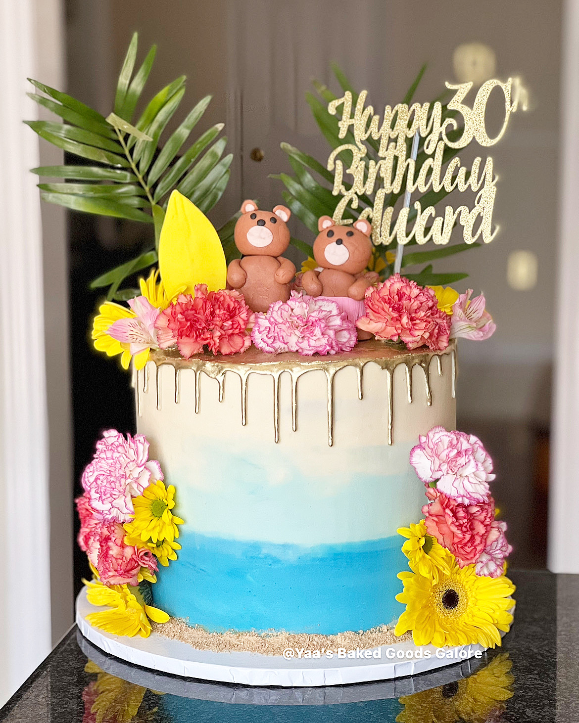 10” Chocolate and Vanilla Hawaiian themed birthday cake with handmade teddy bears, fresh flowers and greenery