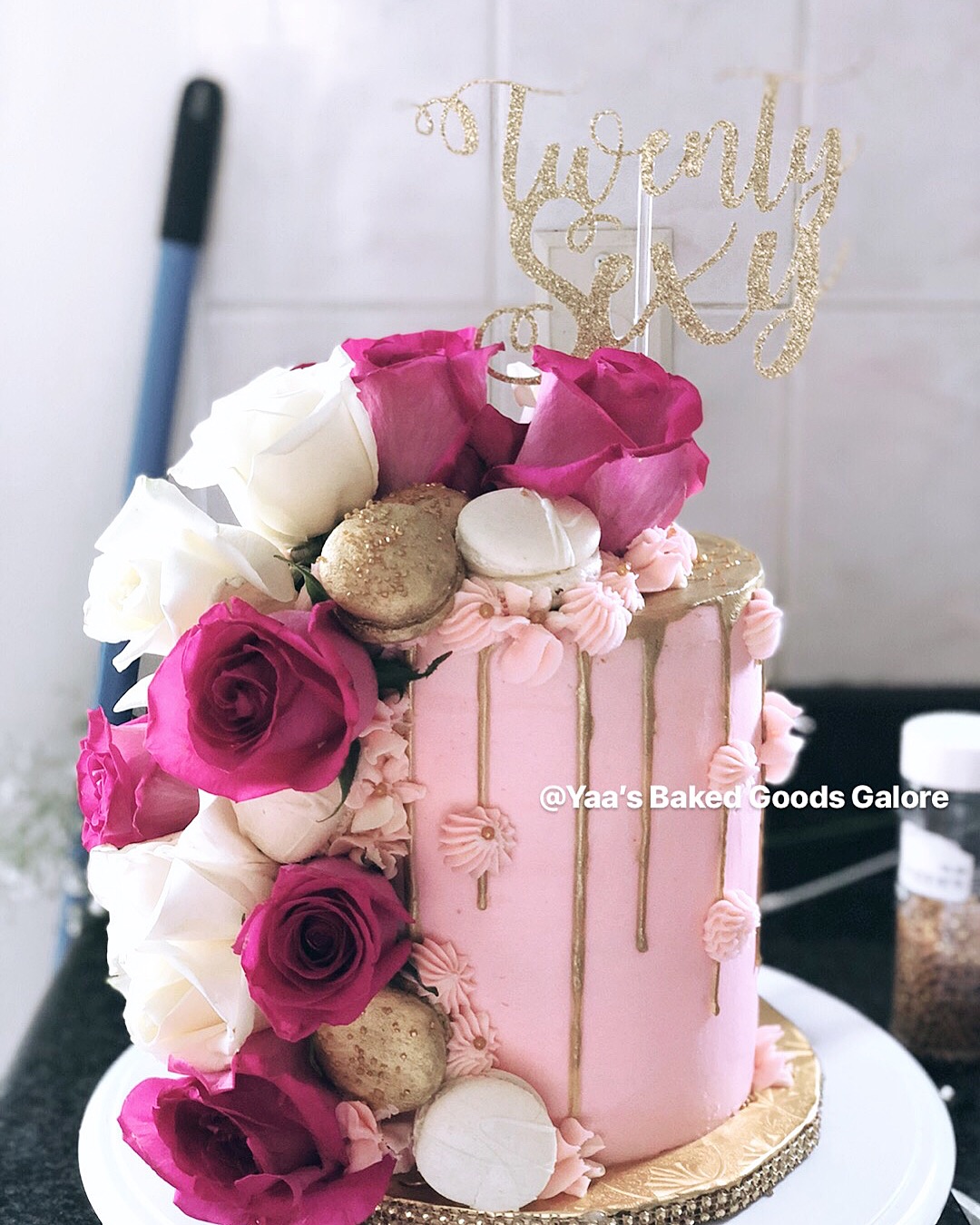 6″ 4 layer Vanilla cake w/ fresh roses and macarons