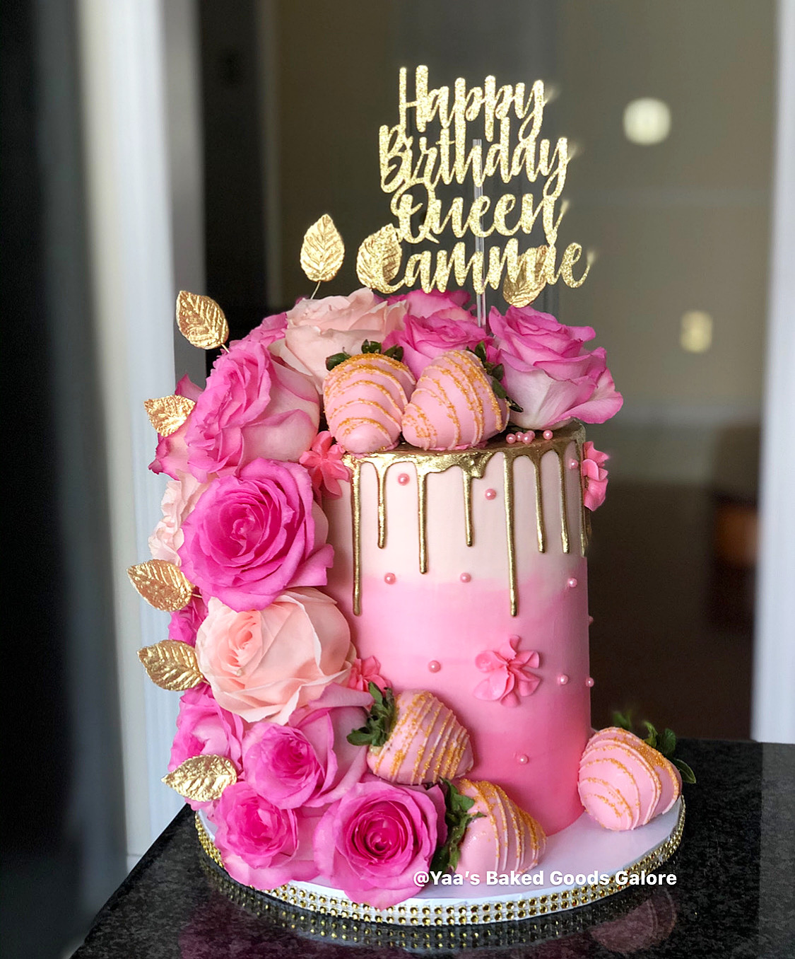 6” Red Velvet YBGG signature design: drip cake with cascading fresh roses and chocolate covered strawberries with fondant gold leaves