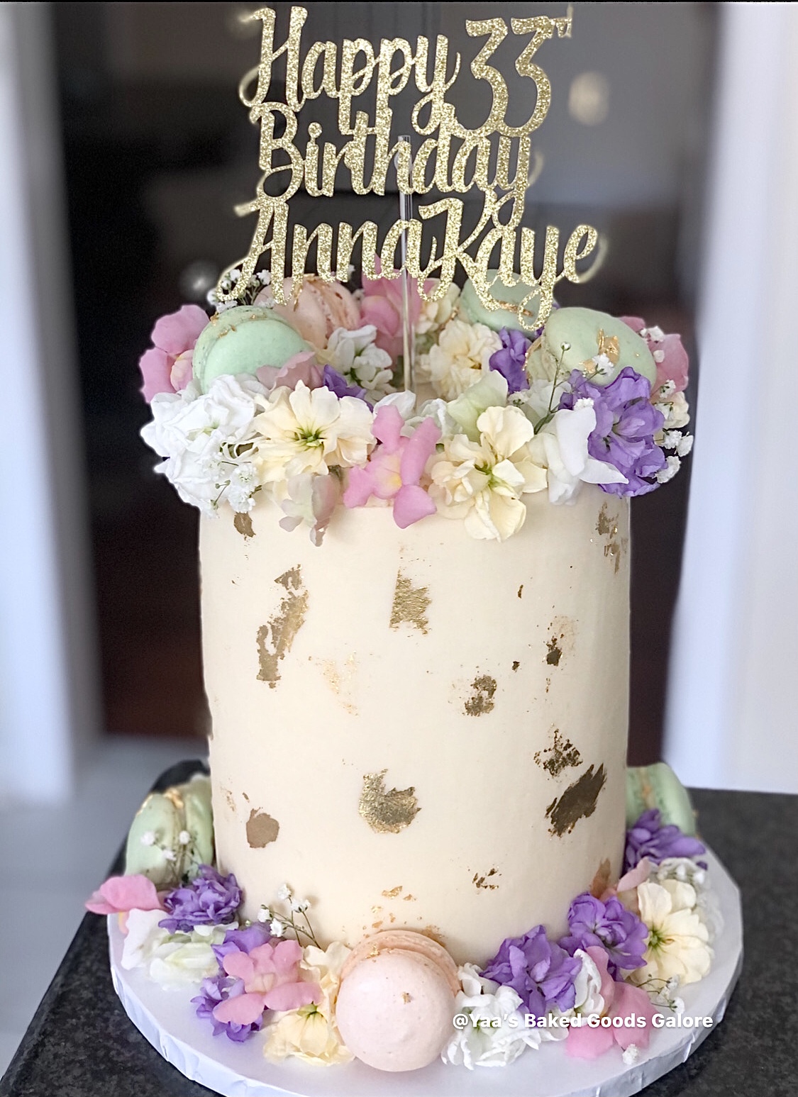 6” Vanilla and Red velvet birthday cake with fresh florals, macarons and edible 24k gold leaf all over