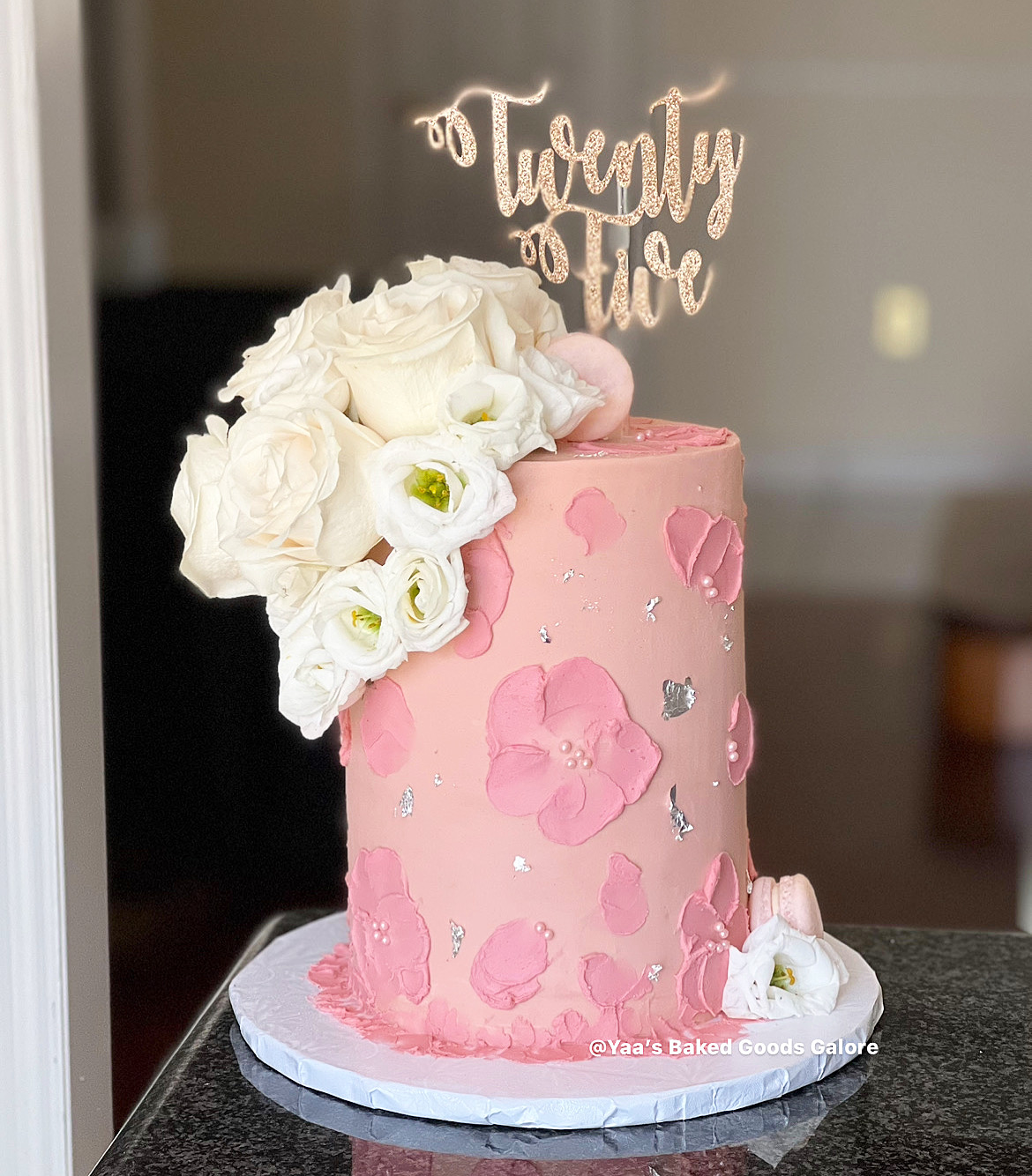 6” Vanilla and Red velvet birthday cake with hand painted icing flowers, fresh flowers and hints of silver leaf all over