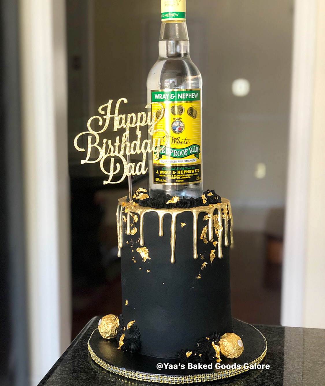 6” Vanilla drip cake with hints of edible 24k gold leaf and Wray & Nephew bottle on top
