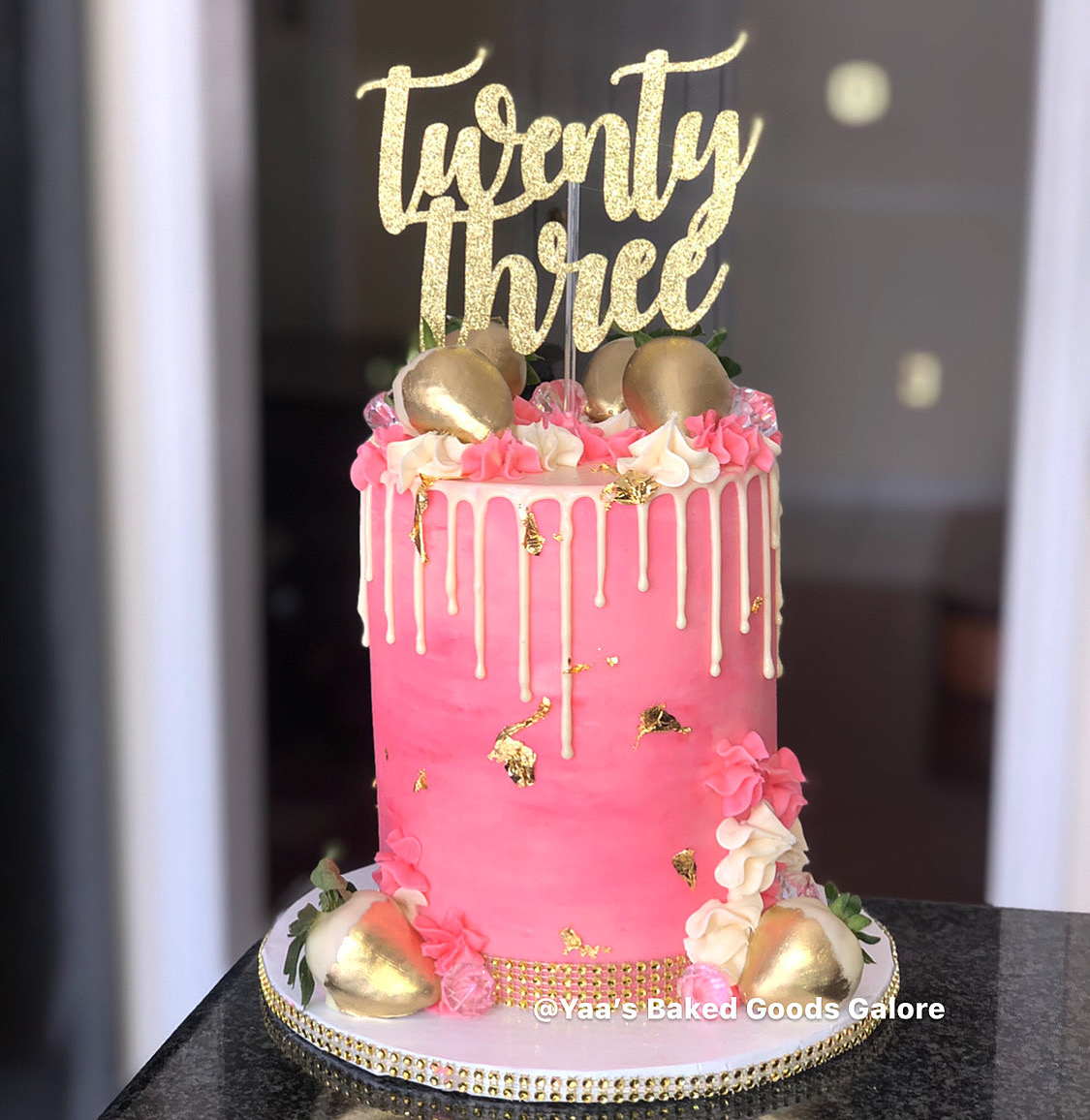 6” Vanilla drip cake with hints of edible 24k gold leaf, chocolate covered strawberries and jewels