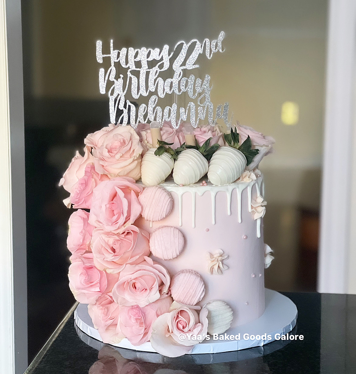 8” Vanilla drip cake with fresh roses, infused chocolate covered strawberries and macarons