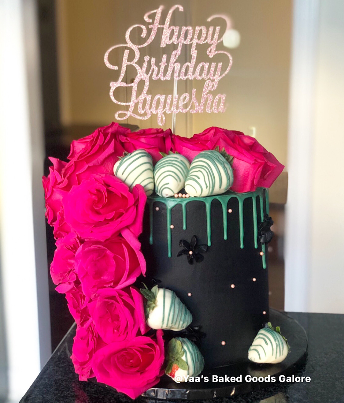8″ Vanilla + Red velvet YBGG signature: drip cake with fresh cascading roses and chocolate covered strawberries
