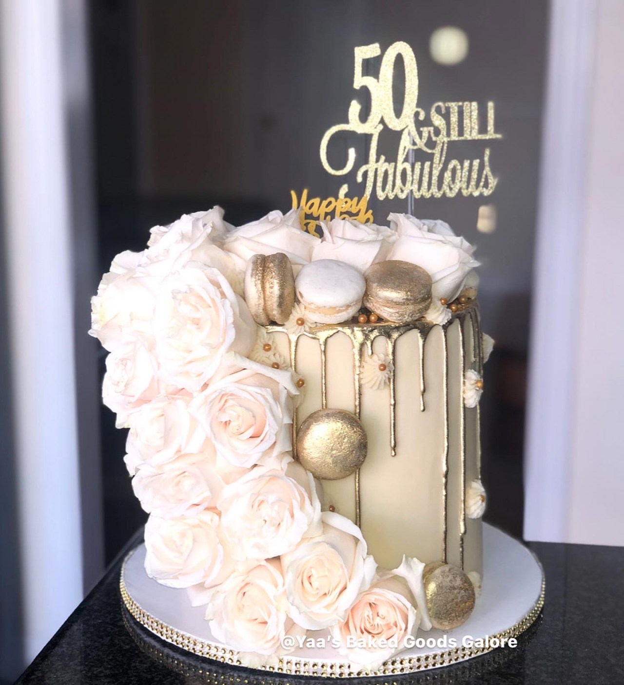 8” Vanilla YBGG signature design: drip cake with cascading fresh roses and macarons plus a surprise!